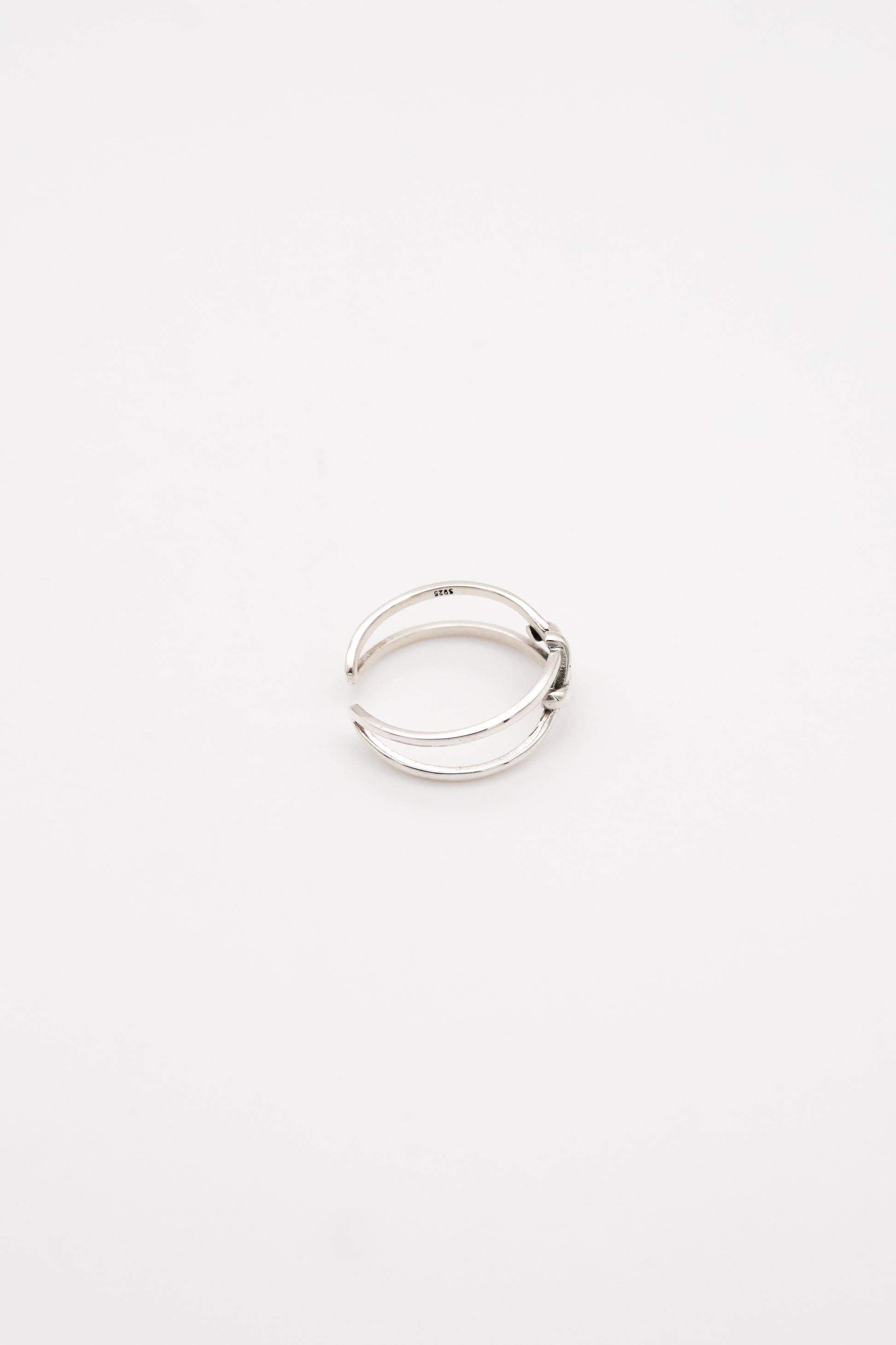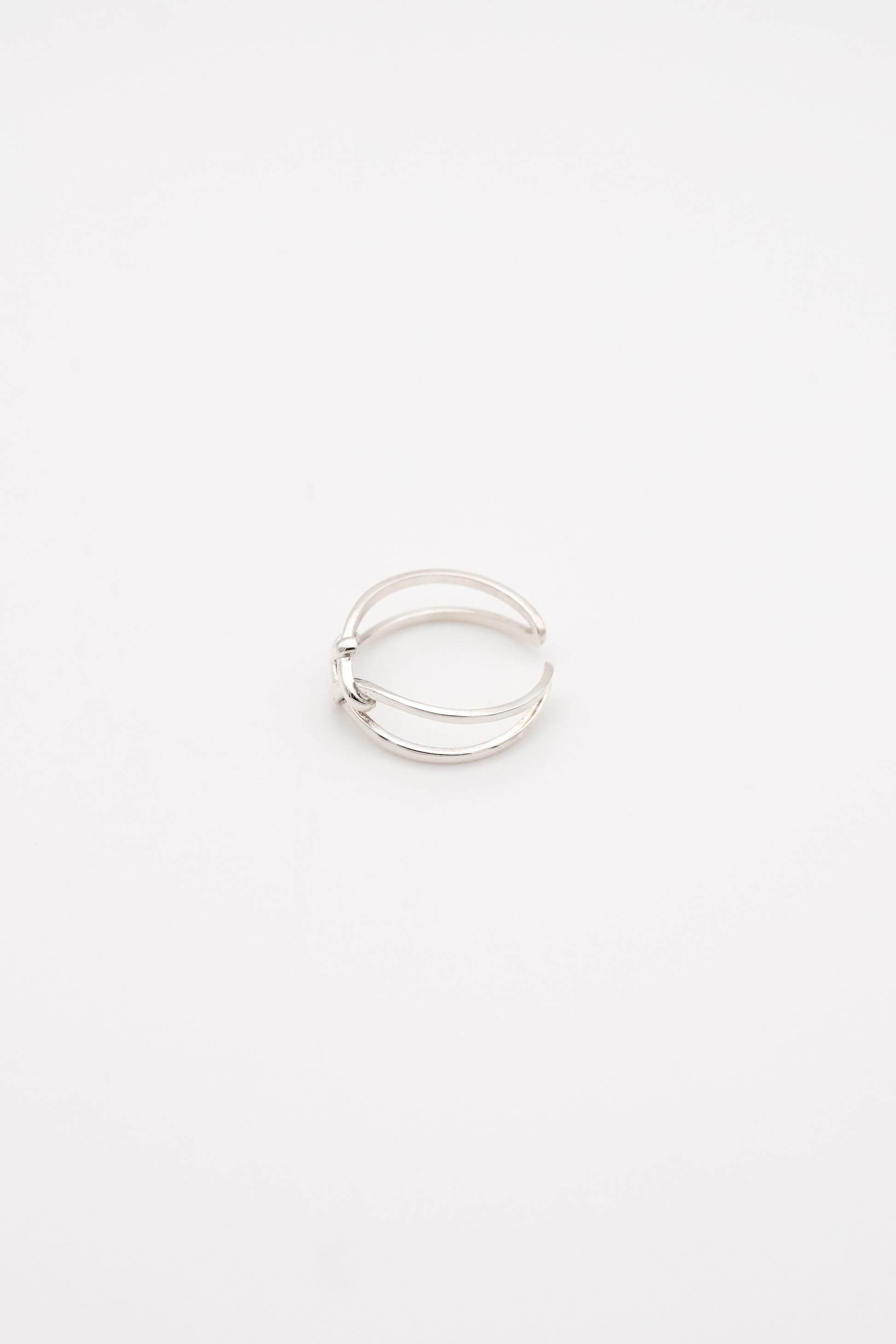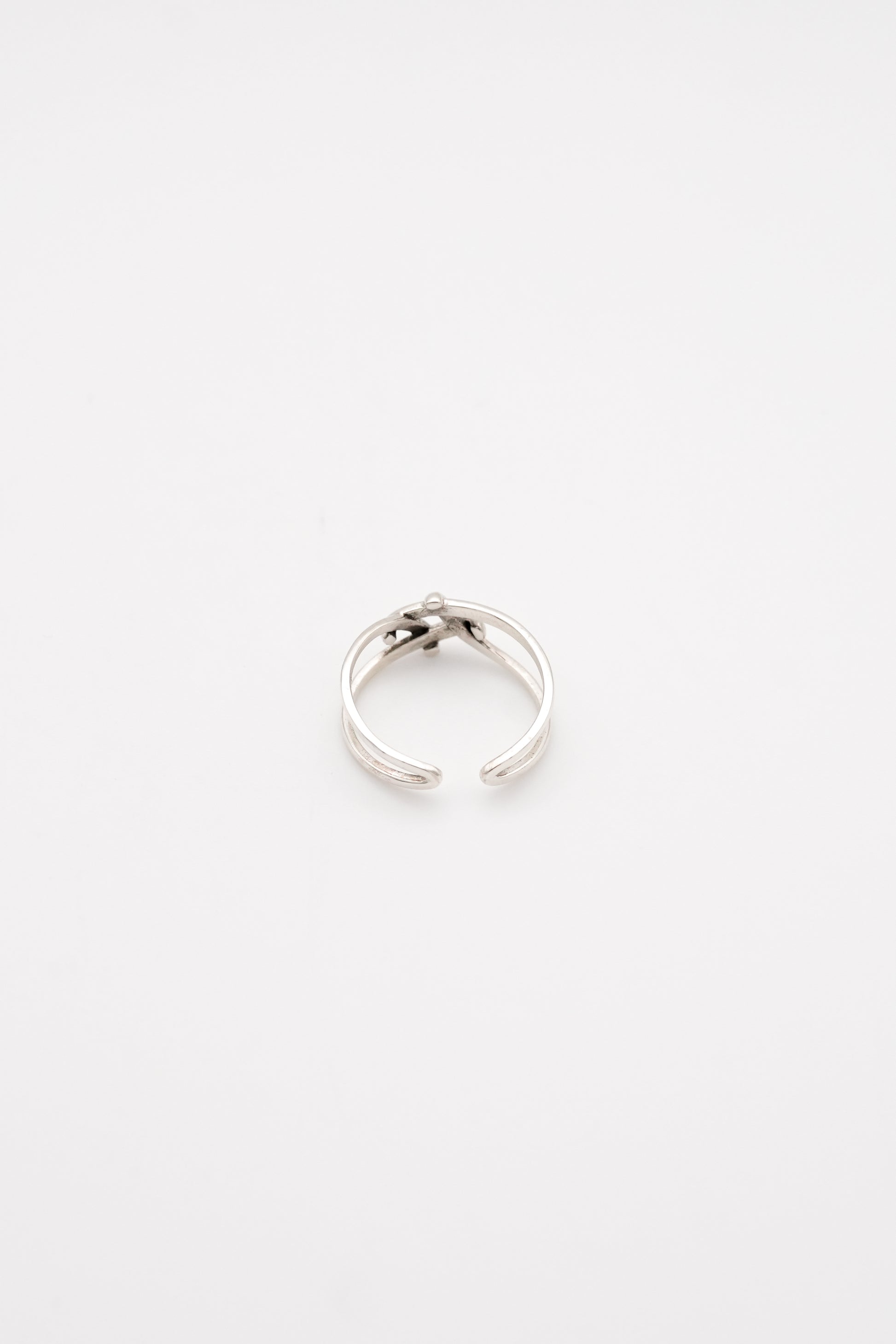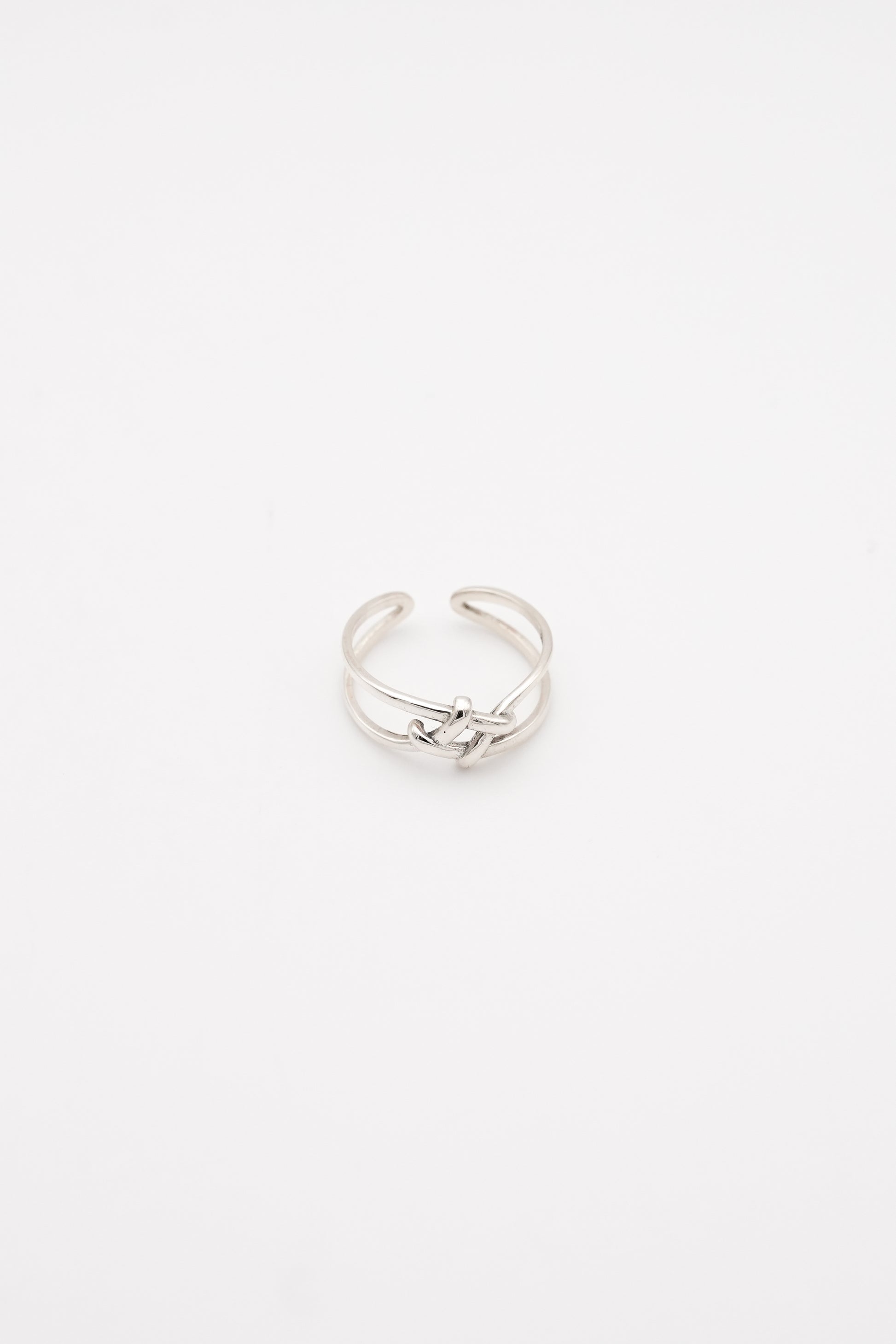 繊細な2本のラインが緩やかに寄り添いながら、中央でクロスするように結ばれたデザインが印象的なシルバーリング