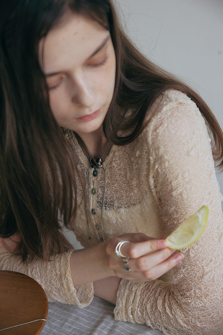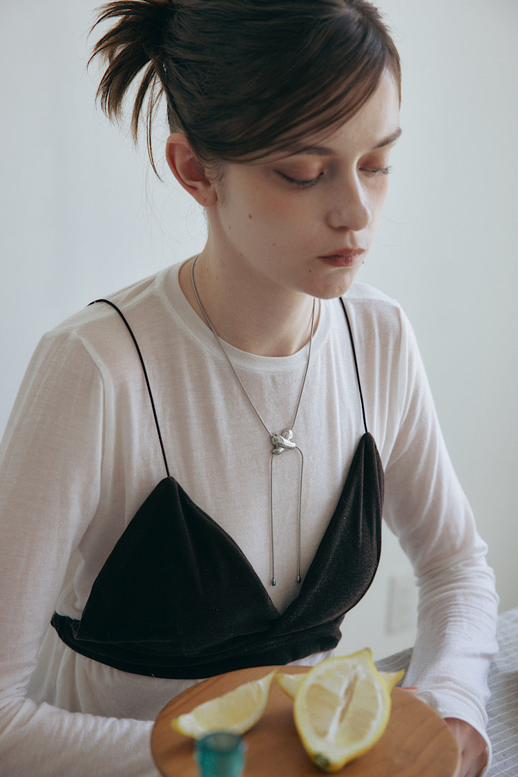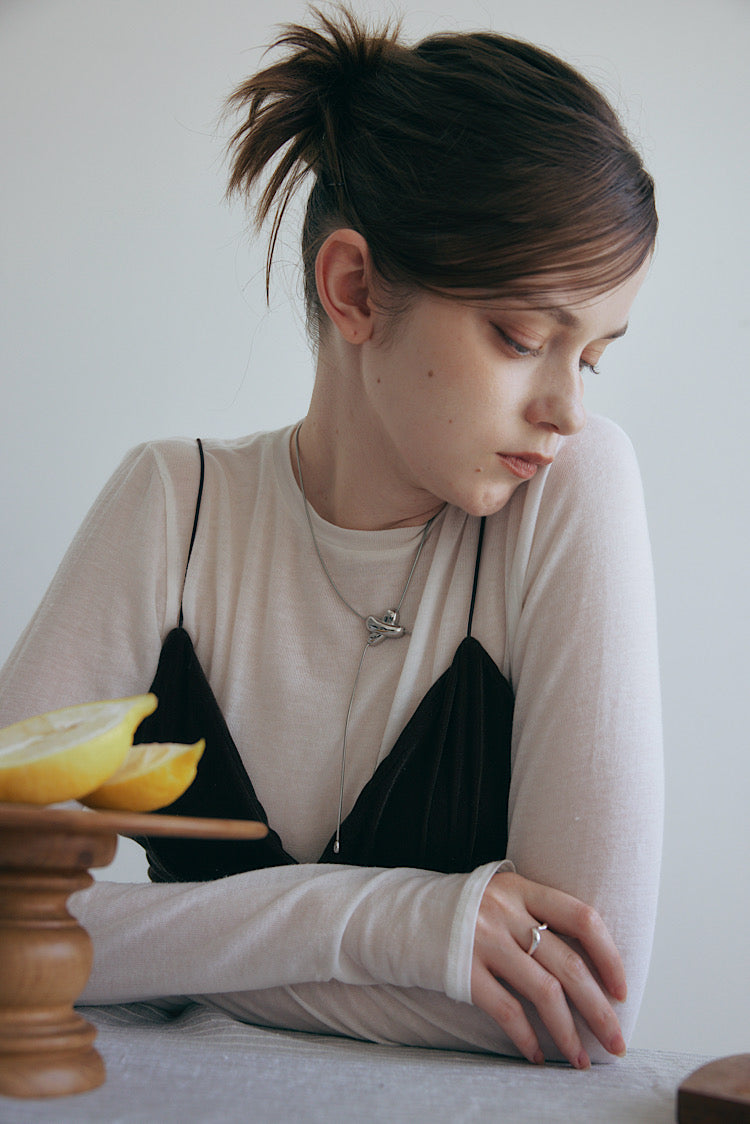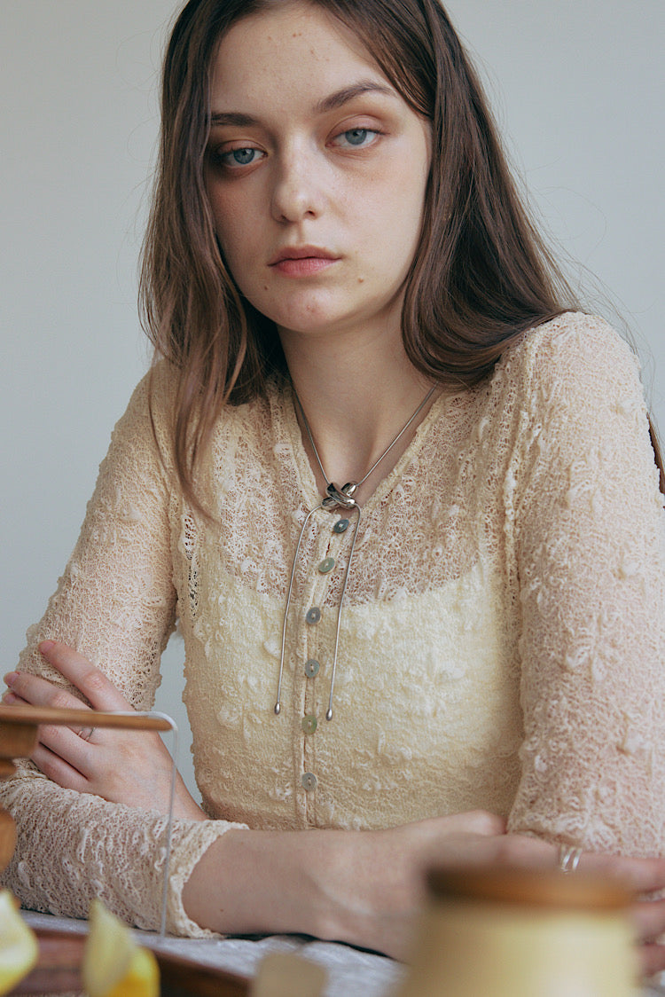 チョーカーのように高めにセットしたり、タイのように長く垂らしたりと、シルエットの変化を楽しめる構造です